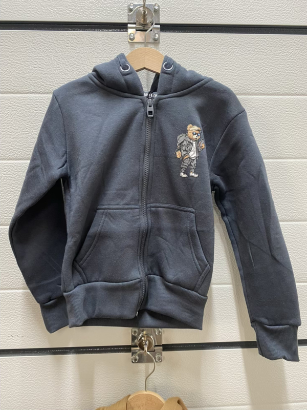 Donkergrijs jongens vest met stoere beer opdruk – met rits & capuchon
