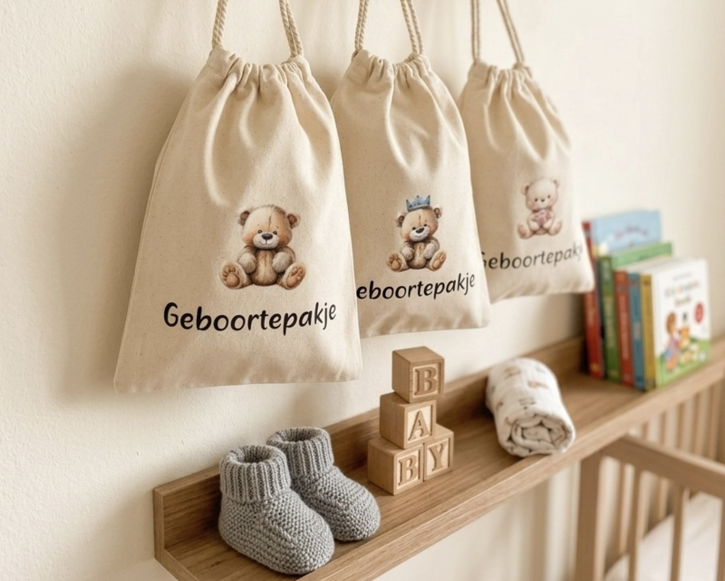 Terug naar overzichtDit lieve katoenen zakje van 20 x 30 cm is perfect om het eerste geboortepakje van je baby veilig en netjes in te bewaren. Op het zakje staat de tekst “Geboortepakje” in het zwart met een schattig beertje met een blauw kroontje, wat zorgt voor een speelse en koninklijke uitstraling.